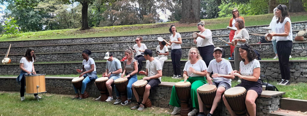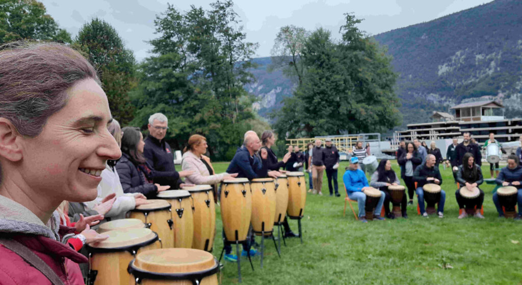 Le programme drumcircle de RYTHM’N TEAM permet également la rencontre d’un public international aux attentes variées en proposant une expérience de teambuilding percutante et engageante. Ce type d’activité de tembuilding peut être organisé dans des espaces professionnels dédiés aux séminaires ou dans des lieux plus informels ou carrément en pleine nature ! Il est tout à fait possible de le programmer en plein air, à la montagne ou au bord du lac.