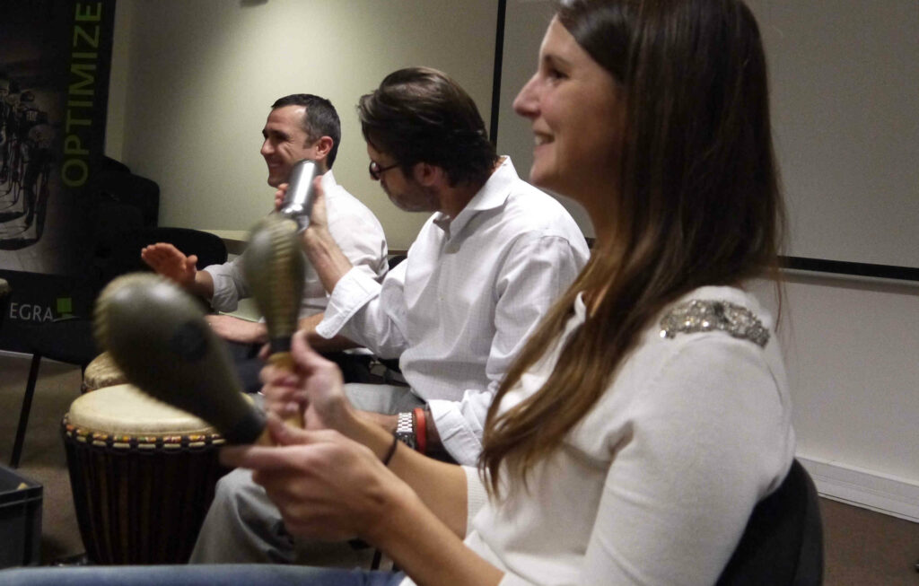 Integra est une société américaine active dans le domaine des biotechnhologies. Des responsables de différents pays se sont retrouvés pour un séminaire de travail à Lyon dans les locaux de l’entreprise. Ils voulaient vivre quelque chose en groupe pour mieux se connaître. Pour contourner la barrière de la langue, ils nous ont demandé de réaliser pour eux une session de musique spontanée. Nous avons opté pour une session de team building musical en mode drumcircle. Le but était de faire vivre au groupe sa dimension créative. Nous les avons donc guidés, à partir de rythmes simples et avec des instruments accessibles, vers une expression musicale originale, créative et spontanée. Grâce à notre connaissance de la musique et des processus de groupes, nous faisons advenir en live la musicalité du groupe. Ainsi, ce sont les participants eux-mêmes qui choisissent leurs instruments et qui créent la musique le plus souvent pour leur plus grand plaisir.